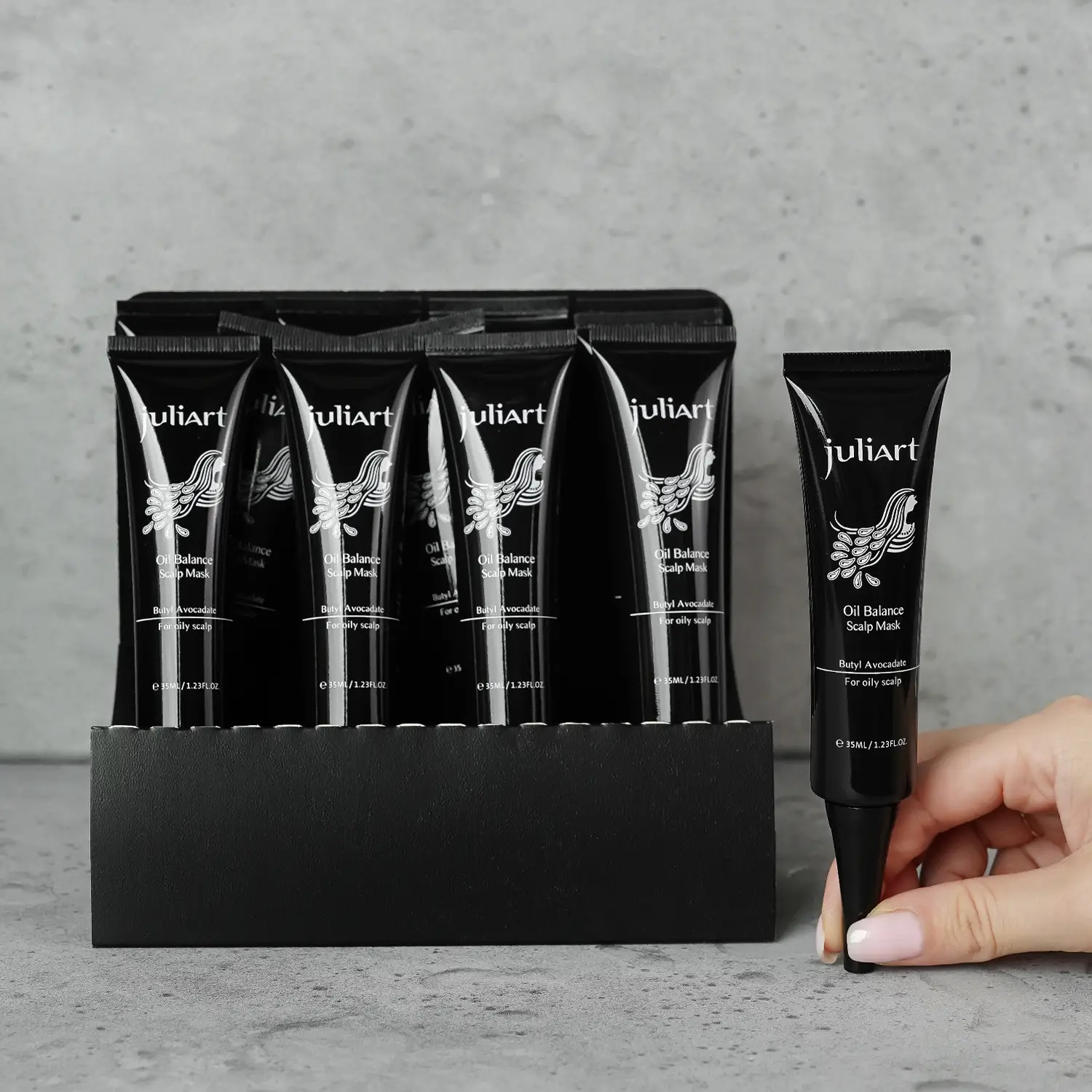 Upewnij się, że cała skóra głowy jest pokryta maską. Następnie spłucz wodą lub dla uzyskania lepszego efektu zastosuj juliArt Exfoliating Shampoo aby zmyć maskę.